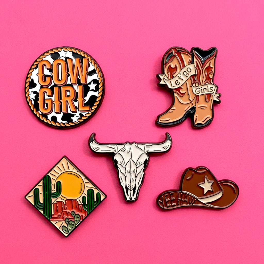 Que vous soyez une Cowgirl dans l'âme ou simplement fan des ambiances Désert et du style Far West, ces broches émail de qualité sont faites pour vous. Découvrez des designs originaux représentant des bottes de cowboy ("Let's go Girls!"), le célèbre crâne de taureau (longhorn), des paysages de cactus ensoleillés, et le cri de ralliement "Yeehaw".